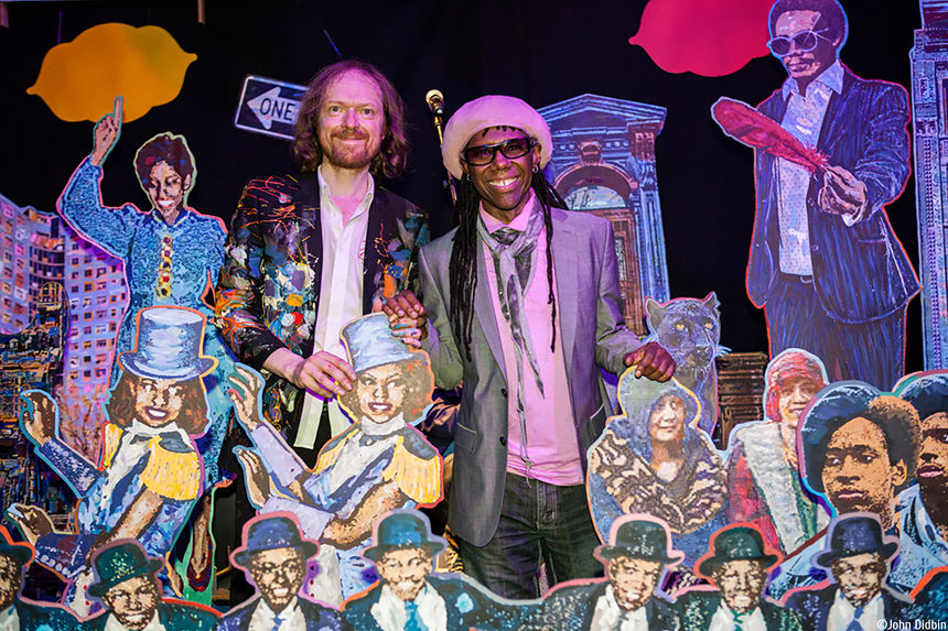 The first stage show emerging from the 7x7 body of work. As Nile Rodgers, accompanied only by his 'billion dollar guitar', improvises on the theme of 'F', interweaving tales of Harlem with the story of his own remarkable life and songs from his legendary repertoire, Jean Pierre creates a Pop-Meets-Constructivism inspired artwork -  from the glory days of the 'Harlem Renaissance' in the 1920's to the present time.  The musical backdrop of the performance includes a seven part suite specially composed by Rodgers for Indigo Night. There are also amazing projections,  including a short film conceived by Pierre Maillard for the 1st movement of Rodgers' Indigo Suite. These ground-breaking performances were premiered over two nights at , Summerhall, Edinburgh.
